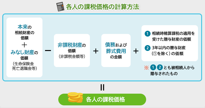 まず、相続をした「本来の財産」と「みなし財産」の合計額から、非課税財産(生命保険金や死亡退職金など)の価額を差し引きます。
