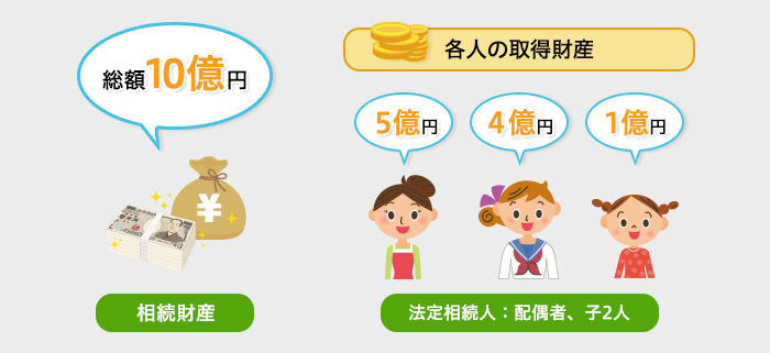 - 各人の取得財産額 … 配偶者が5億円、子Aが4億円、子Bが1億円